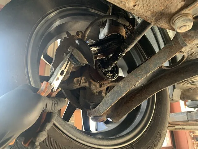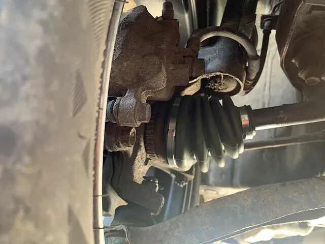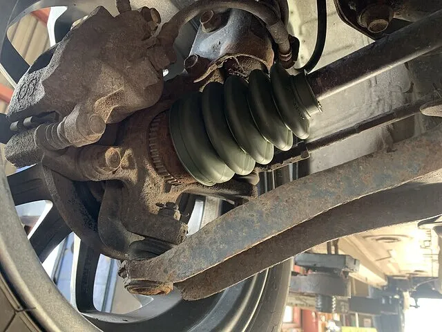 車の下にもぐり込むと、普段はなかなか目にしないドライブシャフトブーツが顔を出します。